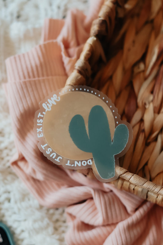 "Don't just exist, live" 3 x 3 handlettered clear sticker