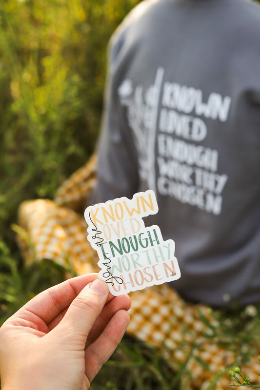 "You are...known, loved, enough..." 3 x 3 handlettered sticker