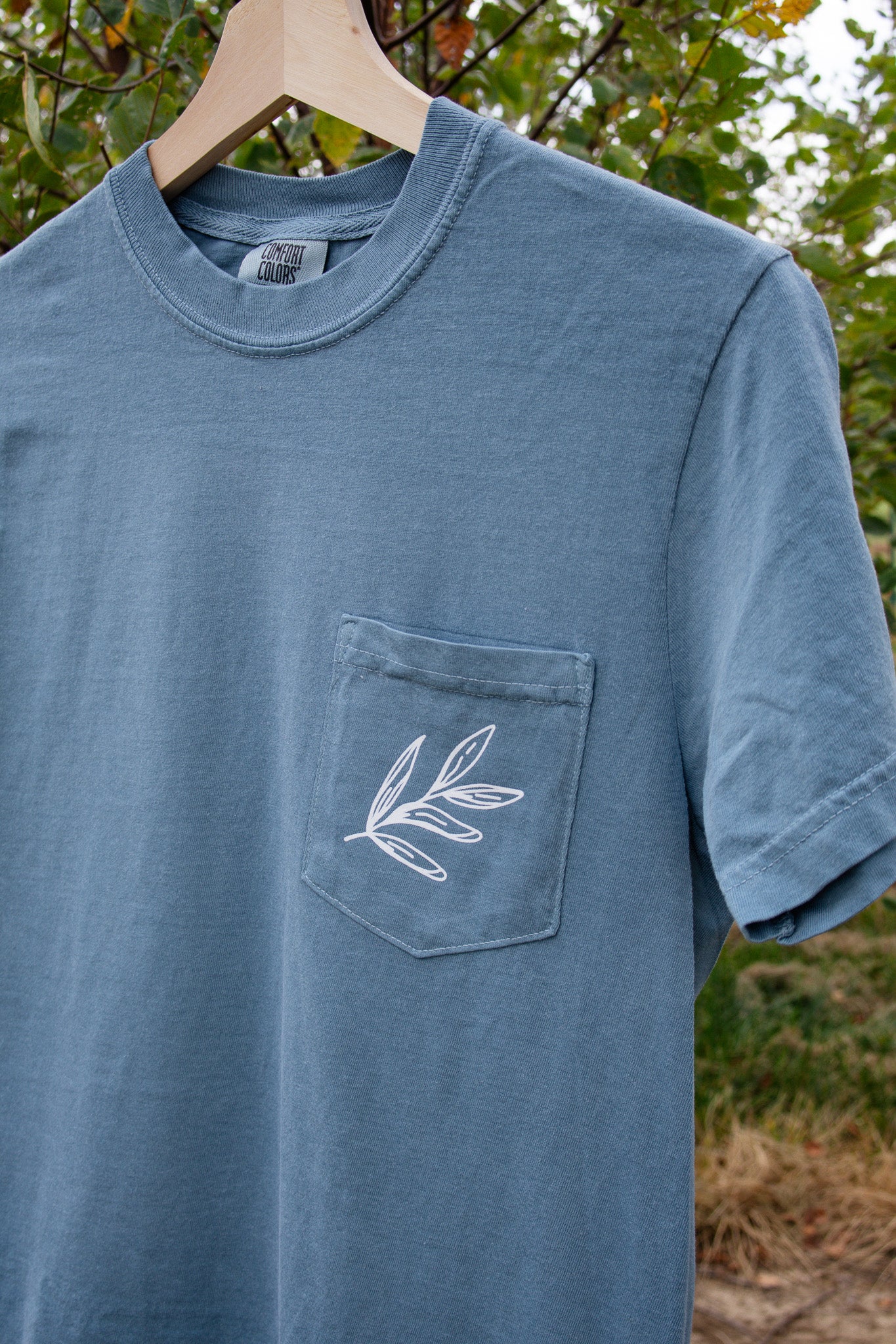 It's made on a ice blue comfort colors tee with a simple floral design on the pocket and a full back design.