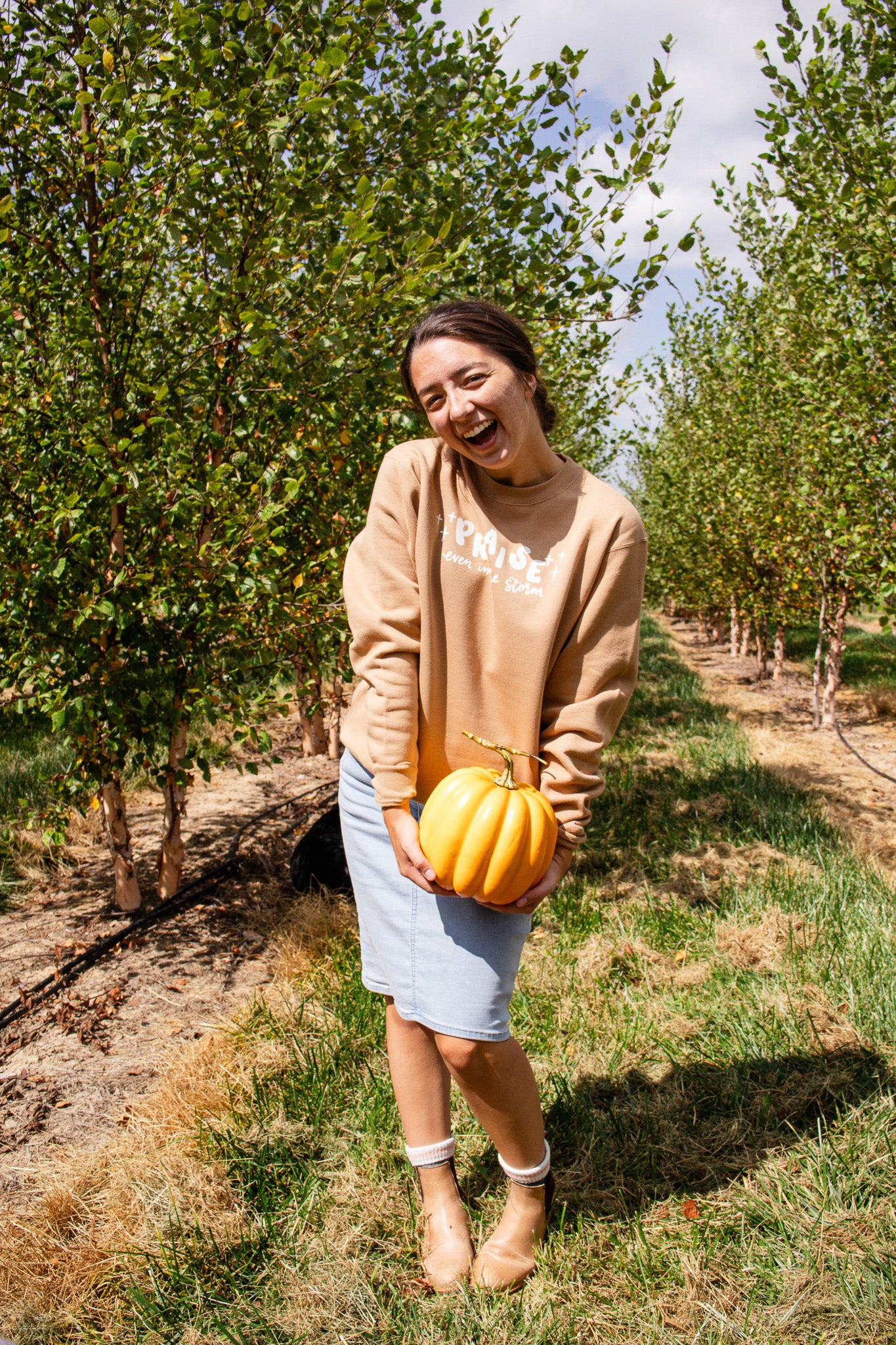 It's made on a buttery soft tan midweight crewneck and features 'Praise even in the storm in white lettering as a center chest design.